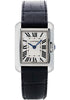 30.2mm x 22.7mm 18K white gold case, 7.19mm thick, nine sided crown set with a sapphire, sapphire crystal, silvered dial with blued steel hands, caliber Cartier 057 quartz movement, black alligator strap, 18K white gold buckle with 14mm ardillon. Water resistant to 30 meters.