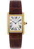 Large size, 18K yellow gold case, silver dial, quartz movement, alligator strap with 18K yellow gold tang type buckle. Water resistant to 30 meters (100 feet).