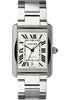 31 x 40.8 mm by 7.65 mm thick stainless steel case, beaded crown set with a synthetic spinel cabochon, sapphire crystal, silver dial with 12 Roman numerals and blued steel hands, caliber Cartier 049 automatic movement, stainless steel bracelet. Water resistant to 30 meters.