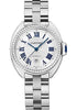 31mm 18K rhodiumized white gold case with brilliant cut diamonds, 11.04mm thick, 18K white gold crown with a sapphire cabochon, sapphire crystal, white dial with flinque sunray effect and blued-steel sword-shaped hands, automatic movement, 18K white gold bracelet. Water resistant to 30 meters.