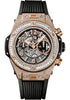 Hublot Big Bang Unico King Gold Jewellery Watch 45 mm satin-finished and polished 18K King Gold case set with 176 diamonds (~1.18 cts), satin-finished and polished 18K King gold bezel set with 48 baguette diamonds (~2.80 cts), andodized black aluminum lower bezel with 6 H-shaped titanium screws, sapphire crystal with anti-reflective treatment and Hublot logo printed on the inner side, dial and indexes set with 212 diamonds (0.72 cts), satin finished and microblasted gold-plated hands with white luminescent, HUB1242 UNICO manufacture self-winding chronograph flyback movement with column wheel, approximately 72 hours of power reserve, black structured lined rubber strap, black PVD titanium deployant buckle with 18K King Gold insert. Water resistant to 100 meters.