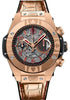 Hublot Big Bang Unico World Poker Tour King Gold Watch 45 mm polished and microblasted 18K King Gold case, polished and microblasted 18K King Gold bezel, red composite resin lower bezel with 6 H-shaped titanium screws, sapphire crystal with anti-reflective treatment and Hublot logo printed on the inner side, mat black dial with gold plated counters, polished gold-plated appliques, polished and satin-finished gold plated hands, red luminescent on hour markers and hands, HUB1242 UNICO manufacture self-winding chronograph flyback movement with column wheel, approximately 72 hours of power reserve, black rubber and gold alligator strap with red stitching, additional black and red alligator strap with red stitching included, black PVD titanium deployant buckle with 18K King Gold insert. Water resistant to 100 meters.