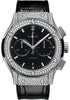45 mm (available in 42 mm) polished titanium case set with 244 diamonds for 1.30ct, polished titanium bezel set with 126 diamonds for (~1.47 cts), sapphire crystal with anti-reflective treatment, black dial with mat black dial, satin-finished rhodium-plated appliques, and polished rhodium-plated hands, HUB1143 self-winding movement with chronograph, approximately 42 hours of power reserve, black rubber and alligator strap, stainless steel deployant buckle. Water resistant to 50 meters.