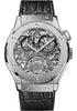 Hublot Classic Fusion Tourbillon Skeleton Titanium Limited Edition of 99 Watch 45 mm polished and satin-finished titanium case, polished and satin-finished titanium bezel with 6 H-shaped titanium screws, sapphire crystal with anti-reflective treatmentand Hublot logo printed on the inner side, sapphire dial with polished rhodium-plated appliques and hands, HUB6310 manual movement with tourbillon chronograph, approximately 115 hours of power reserve, black rubber and alligator strap, stainless steel deployant buckle.