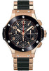 41mm 18k red gold case, black ceramic bezel, black composite resin lateral inserts and bezel lugs, black dial, self winding HUB 4300 movement with chronograph function, approximately 42 hours of power reserve, 18K red gold and black ceramic bracelet. Water resistant to 100 meters.