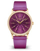 The dial base embossed with a concentric waves pattern is coated with more than fifty successive layers of translucent lacquer creating a fascinating depth effect. The shade of the dial is echoed by the purple calfskin strap with satinated finish and rose gold prong buckle.