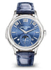 The only watch in the current Patek Philippe collection to unite a minute repeater, a tourbillon and an instantaneous perpetual calendar with aperture displays, the Reference 5207 Grand Complication now debuts in a white-gold case embellished with hand engraving and complemented by a blue sunburst dial. This masterpiece of acoustics and micromechanics houses a manually wound caliber composed of 557 individual parts.