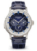 Patek Philippe brilliantly reinterprets Reference 5374 — a combination of two highly sought-after major complications — in a new platinum Haute Joaillerie version with a blue-lacquered dial. The case with its subtle play on curves is paved with baguette-cut diamonds tracing a luminous geometrical pattern. The concave bezel adorned with a double row of baguette diamonds forms a perfect circle. The dial flange is also set with baguette diamonds, with baguette blue sapphires on the hour-markers. This original design forms an “amphitheater” around the dial and creates a spectacular depth effect. The visual balance of the perpetual calendar indications shown by hands, standing out against the blue-lacquered background with black-gradient rim, is thus particularly highlighted.