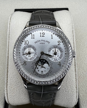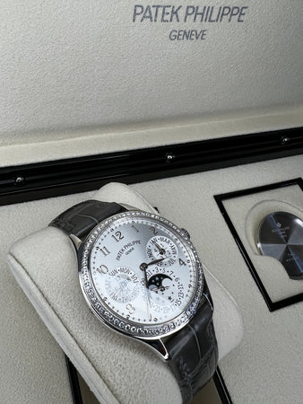 The ultra-thin self-winding Ladies First Perpetual Calendar is now available in a new white-gold model that complements the rose-gold version. The diamond-set bezel deflects the light on a silvery sunburst dial with applied numerals and minute pearls in gold. A Grand Complication with incomparable feminine appeal.