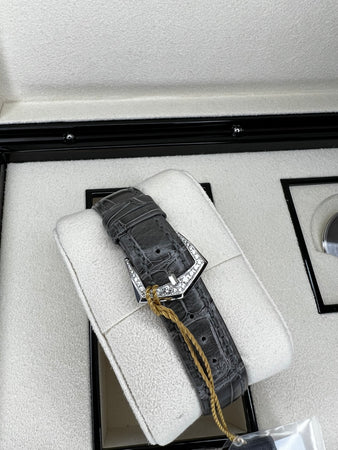 Alligator straps with square scales, hand-stitched, shiny gray (originally fitted) or shiny turquoise green (additional strap), prong buckle set with 27 diamonds (~0.2 ct). Alligator straps with square scales, hand-stitched, shiny gray (originally fitted) or shiny turquoise green (additional strap). Prong buckle set with 27 diamonds (~0.2 ct). |