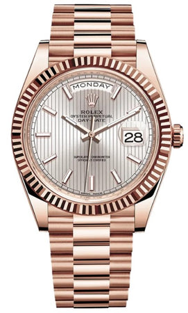 The Rolex Presidential Day-Date 40mm is an essential must-have for any collector. An opulent masterpiece, it is inlaid in 18ct Rose Gold and designed with a lavish Sundust Diagonal Motif dial, scratch-proof sapphire crystal, a fluted bezel and automatic movement. The signature Presidential bracelet includes, semi-circular three-piece links and embodies excellence and charm.