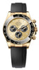 This Oyster Perpetual Cosmograph Daytona in 18 ct yellow gold, with a golden and bright black dial and an Oysterflex bracelet, features a black Cerachrom bezel with an engraved tachymetric scale.