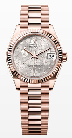 This Oyster Perpetual Datejust 31 in 18 kt Everose gold features a silver floral-motif, diamond-set dial and a President bracelet.