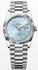 The Oyster Perpetual Day-Date 36 Ref. 128236-0009 in platinum with an ice-blue, diamond-set dial, fluted bezel and a President bracelet.