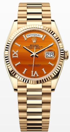 Day-Date 36 Oyster, 36 mm, yellow gold The Oyster Perpetual Day-Date 36 in 18 ct yellow gold with a carnelian, diamond-set dial, fluted bezel and a President bracelet. More Day-Date technical details Reference 128238-0088 Model case Model case Oyster, 36...