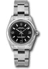 31mm brushed stainless steel case, domed bezel, black dial, index hour markers and Arabic numerals, and brushed stainless steel Oyster bracelet.