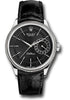 39mm 18K white gold case, domed and fluted double bezel, screw down winding crown, domed sapphire crystal, black guilloche dial with 18K white gold hour markers and hands, self-winding movement with date display by hand on a sub-dial at 3 o'clock, approximately 48 hours of power reserve, shiny black alligator leather strap with 18K white gold buckle. Waterproof to 50 meters.