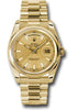 36mm 18K yellow gold case, domed bezel, champagne dial, index hour markers, and President bracelet.
