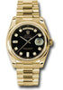 36mm 18K yellow gold case, domed bezel, black dial, 8 round and 2 baguette diamond hour markers, and President bracelet.