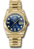 36mm 18K yellow gold case, domed bezel, blue dial, 8 round and 2 baguette diamond hour markers, and President bracelet.