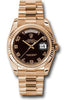 36mm 18K pink gold case, fluted bezel, black dial, Arabic numerals, and President bracelet.