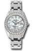 39mm 18K white gold case, screw-down back, screw-down crown with twinlock double waterproofness system, bezel set with 36 diamonds, scratch-resistant sapphire crystal with cyclops lens over the date, white mother-of-pearl dial, 10 diamond hour markers, Rolex calibre 3235 automatic movement, Datejust Pearlmaster bracelet with rounded five-piece links, concealed folding Crownclasp buckle. Waterproof to 100 meters.
