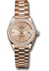 28mm 18K Everose gold oyster case, screw-down crown with twinlock double waterproofness system, bezel set with 44 diamonds, scratch-resistant sapphire crystal with cyclops lens over the date and double anti-reflective coating, pink sundust dial, index hour markers with Chromalight, Rolex calibre 2236 automatic movement with center hour, minute and seconds hands, instantaneous date with rapid setting, and stop-seconds for precise time setting, 18K Everose gold President bracelet with semi-circular three-piece links, concealed folding Crownclasp buckle. Waterproof to 100 meters.