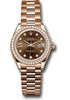 28mm 18K Everose gold oyster case, screw-down crown with twinlock double waterproofness system, bezel set with 44 diamonds, scratch-resistant sapphire crystal with cyclops lens over the date and double anti-reflective coating, chocolate dial, 9 diamonds set in star shaped hour marker settings and 8 diamond set in Roman numeral IX, Rolex calibre 2236 automatic movement with center hour, minute and seconds hands, instantaneous date with rapid setting, and stop-seconds for precise time setting, 18K Everose gold President bracelet with semi-circular three-piece links, concealed folding Crownclasp buckle. Waterproof to 100 meters.