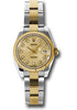 26mm stainless steel case, 18K yellow gold fluted bezel, champagne Jubilee dial, diamond hour markers, and stainless steel and 18K yellow gold Oyster bracelet.