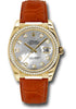 36mm 18K yellow gold case, bezel set with 60 diamonds, mother of pearl dial, diamond hour markers, and leather strap with 18K yellow gold deployable clasp.
