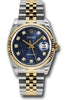 36mm stainless steel case, 18K yellow gold fluted bezel, blue concentric circle dial, Arabic numerals, and stainless steel and 18K yellow gold Jubilee bracelet.