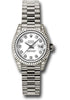 26mm 18K white gold case, case lugs set with 24 diamonds, fluted bezel, white dial, diamond hour markers, and President bracelet.