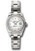 26mm 18K white gold case, fluted bezel, mother of pearl dial, diamond hour markers, and Oyster bracelet.