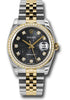 36mm stainless steel case, 18K yellow gold screw-down crown, 18K yellow gold bezel set with 52 brilliant-cut diamonds, scratch-resistant sapphire crystal with cyclops lens over the date, black Jubilee dial, diamond hour markers, Rolex calibre 3135 automatic movement, stainless steel and 18K yellow gold Jubilee bracelet with five-piece links, concealed folding Crownclasp buckle. Waterproof to 100 meters.