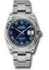 36mm stainless steel case, 18K white gold fluted bezel, blue dial, stick hour markers, and Oyster bracelet.