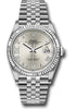 36mm Oystersteel case, screw-down steel back, screw-down crown with twinlock double waterproofness system, fluted bezel, scratch-resistant sapphire crystal with cyclops lens over the date, silver dial, Roman numerals with diamond set 6 and 9, Rolex calibre 3235 perpetual self-winding movement with center hour, minute and seconds hands, instantaneous date at 3 o'clock with rapid setting, and stop-seconds for precise time setting, approximately 70 hours of power reserve, Jubilee bracelet with five-piece links, folding Oysterclasp buckle with Easylink 5mm comfort extension link. Waterproof to 100 meters. Baselworld 2019 release.