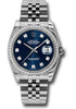 36mm stainless steel case, 18K white gold bezel set with 52 brilliant-cut diamonds, blue dial, diamond hour markers, and stainless steel Jubilee bracelet.