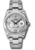 36mm stainless steel case, domed bezel, silver floral dial, Arabic numerals, and Oyster bracelet.
