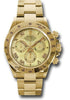 Rolex Oyster Perpetual Cosmograph Daytona 116528 ymr 40mm 18K yellow gold case, tachymeter engraved bezel, screw-down push buttons, yellow mother of pearl dial, Roman numerals, and Oysterlock bracelet.