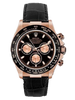 Rolex Oyster Perpetual Cosmograph Daytona 116515LN bkp 40mm 18K Everose gold case, screw-down back, screw-down crown and push buttons with Triplock triple waterproofness, black monobloc Cerachrom bezel with engraved tachymetric scale, scratch-resistant sapphire crystal, black dial with pink subdials, Rolex calibre 4130 automatic movement, black leather strap, Everose gold folding Oysterlock safety buckle. Waterproof to 100 meters.