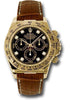 Rolex Oyster Perpetual Cosmograph Daytona 116518 bkdbr 40mm 18K yellow gold case, tachymeter engraved bezel, screw-down push buttons, black dial, 8 diamond hour markers, and brown strap with 18K yellow gold deployable fliplock clasp.