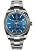 DESCRIPTION: Rolex Oyster Sky-Dweller 42 Watch 326934 bl 42mm white Rolesor case comprised of a 904L steel monobloc middle case, screw-down back, screw-down crown, 18K white gold fluted bezel with bidirectional rotatable Rolex Ring Command, scratch-resistant sapphire crystal with cyclops lens over the date and double anti-reflective coating, blue dial, index hour markers, Rolex calibre 9001 automatic movement , second time-zone displayed via off-center rotating disc, Saros annual calendar with date at 3 o'clock and month indicated in discrete apertures at each of the 12 hour marks, stainless steel Oyster bracelet, folding Oysterclasp buckle with Easylink 5mm comfort extension link. Waterproof to 100 meters.