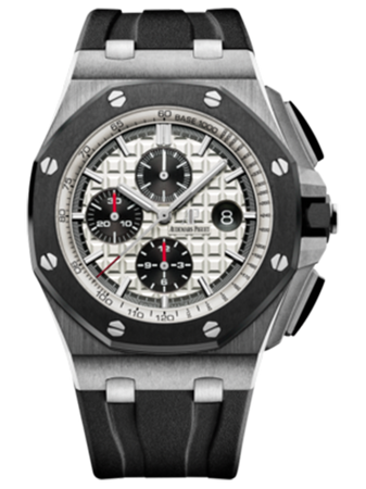 Selfwinding chronograph with date display and small seconds at 12 o'clock. Stainless steel case, silvered and black dial, black strap. Stainless steel case, glareproofed sapphire crystal and caseback, black ceramic bezel, screw-locked crown and pushpieces, stainless steel pushpiece guards. Silver-toned dial with “Méga Tapisserie” pattern, black counters, gold applied hour-markers and gold Royal Oak hands with luminescent coating, silver-toned inner bezel ring.