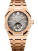 The new Selfwinding Flying Tourbillon’s smoked grey sunburst "Tapisserie" dial radiating from the flying tourbillon cage elegantly contrasts with the 18-carat pink gold case and bracelet. 18-carat pink gold case, glareproofed sapphire crystal and caseback, screw-locked crown. Smoked grey dial with “Evolutive Tapisserie” pattern, pink gold applied hour-markers and Royal Oak hands with luminescent coating. 18-carat pink gold bracelet with AP folding clasp.