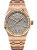 Seamless pink gold and diamond-rich bezel elegantly balanced with nickel grey “Grande Tapisserie” dial. 18-carat pink gold case, glareproofed sapphire crystal and caseback, diamond-set bezel. Grey nickel-toned dial with “Grande Tapisserie” pattern, pink gold applied hour-markers and Royal Oak hands with luminescent coating.
